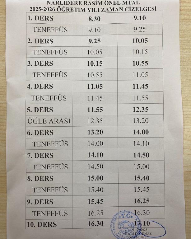 2025-2026 Eğitim Öğretim Yılı Rasim Önel Ticaret MTAL Okul Zaman Çizelgesi