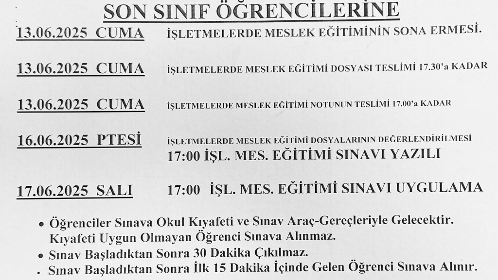 Okulumuz Son Sınıf Öğrencilerine İşletmelerde Mesleki Eğitim Dersi Önemli Duyurusudur